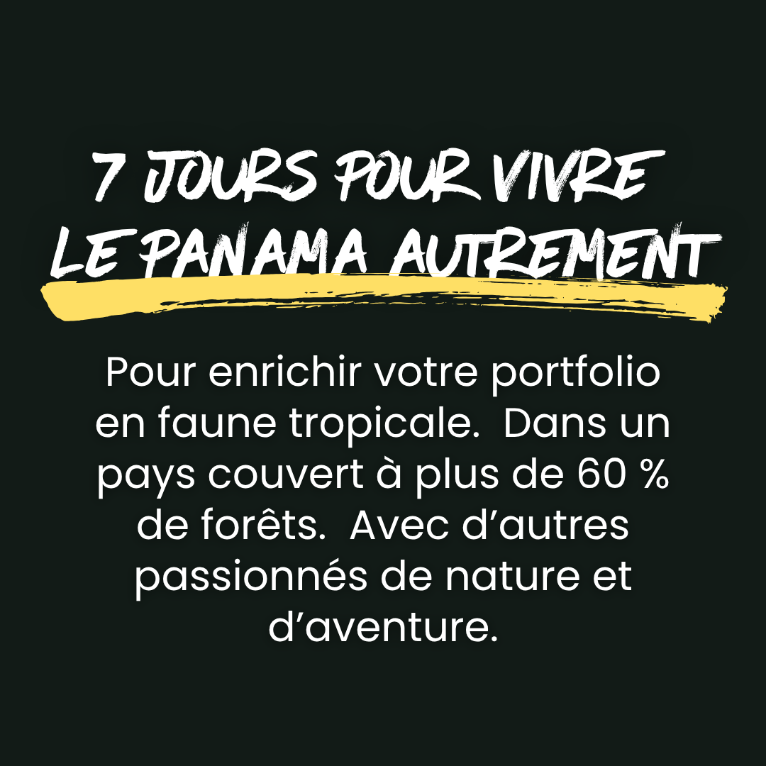 Depuis 2012, le Panama est devenu mon deuxième chez-moi. Ce pays réunit tout ce qui nourrit mes deux passions : la photo et la nature. Je vous propose de le découvrir autrement : je vous accompagne en petit groupe, en français, sur un itinéraire repéré pour observer, comprendre et photographier la vie sauvage. Rendez-vous en février ?